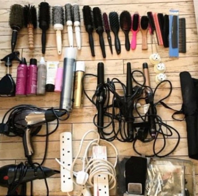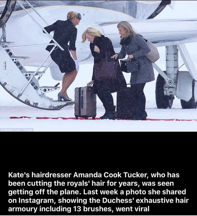 Catherine’s glam squad are never far from the Duchess. Amanda revealed on her Instagram (which has since been taken down) all the styling tools she uses on the Duchess’s hair. Here is a flat lay photo from Amanda depicting the 13 brushes of varying sizes and shapes, numerous combs, curling wands and hair products used.